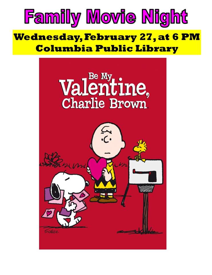Tomorrow night | It’s a movie night make-up night at the Columbia Public Library. “Due to last week’s snow storm, our Family Movie night has been switched to Wednesday, February 27, in the library Community Room. “Be My Valentine, Charlie Brown” will begin at 6 PM. For all ages.”