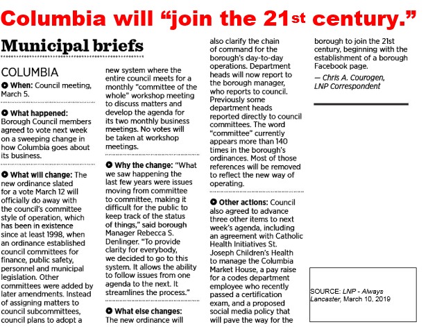 Citizens benefit | The Columbia Borough March Council meeting is scheduled for Tuesday, March 12 at 7:00 pm. The meeting agenda and a meeting packet is posted at the Borough Website. Columbia’s citizens should be delighted with the comprehensiveness of the Meeting Packet.