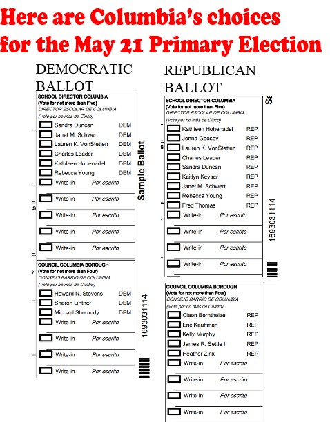 This is a “redacted” view of the Sample Ballot at the County Board of Elections Website showing only the local candidates for school board of directors and borough council.