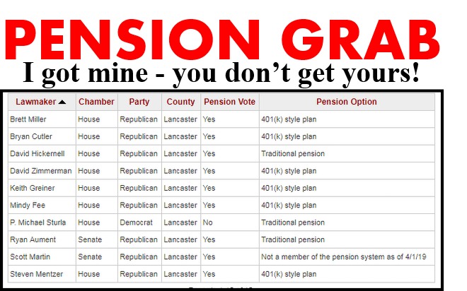 VOTE THEM OUT | Note that these Lancaster County elected public servants want to stay at the public trough: Hickernell, Sturla and Aument. Two others – Gillen and Cox – representing tiny slices of Lancaster County due to partisan gerrymandering, also voted to stay at the public trough.