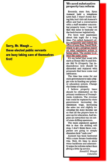 Baer nails it | Though this Philly.com column (State lawmakers mostly duck the pension reform they passed for others) may be locked by a paywall for you,  columnist John Baer nails it again. He writes about the recent “I got mine – you don’t get yours” over-paid and ethically challenged legislators we send to Harrisburg to represent us. In the column, he writes, We know it (the legislature) values self-service above public service. We’ve learned to view it (that legislature) with low expectations.”
