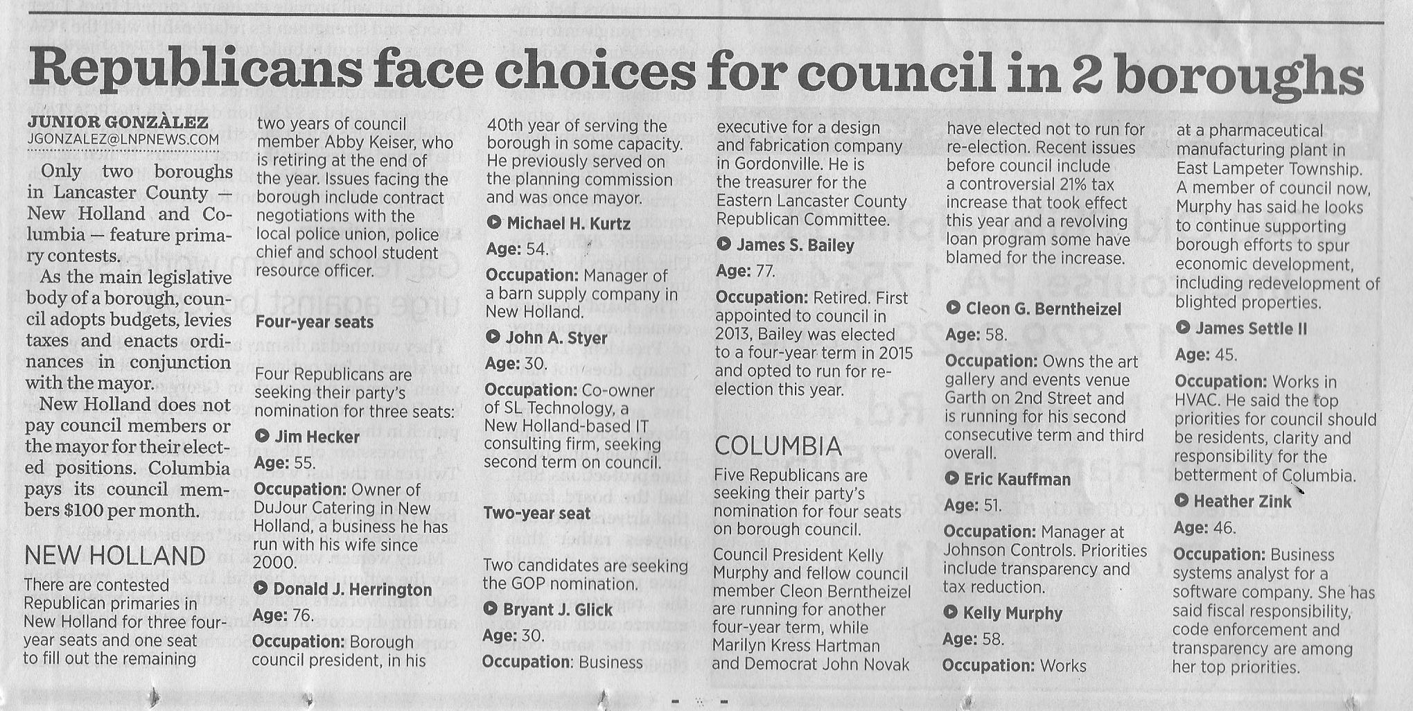 Paging through the “hold-it-in-your-hands” version of Lancaster Newspapers daily newspaper, LNP – Always Lancaster, we found this article, “Republicans face choices for council in 2 boroughs.” What no listing of persons on the other major party?