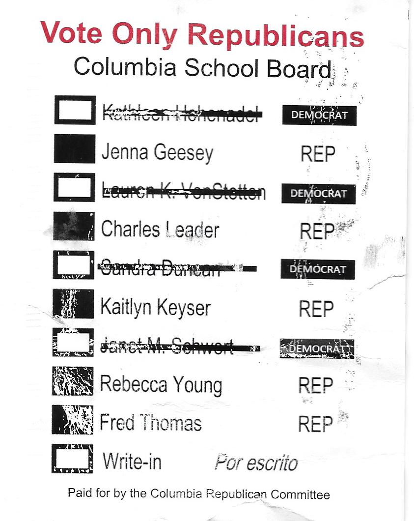 On Tuesday in this election, if you’re registered Republican or Democratic, you’ll be given a ballot populated by names of persons seeking the party anointment for the office in the general election in November. Many candidates for school board of directors cross-file in both parties because school board of directors are supposed to be apolitical, in spite of the Columbia Republican Committee’s “Jump Johnny” taunt.