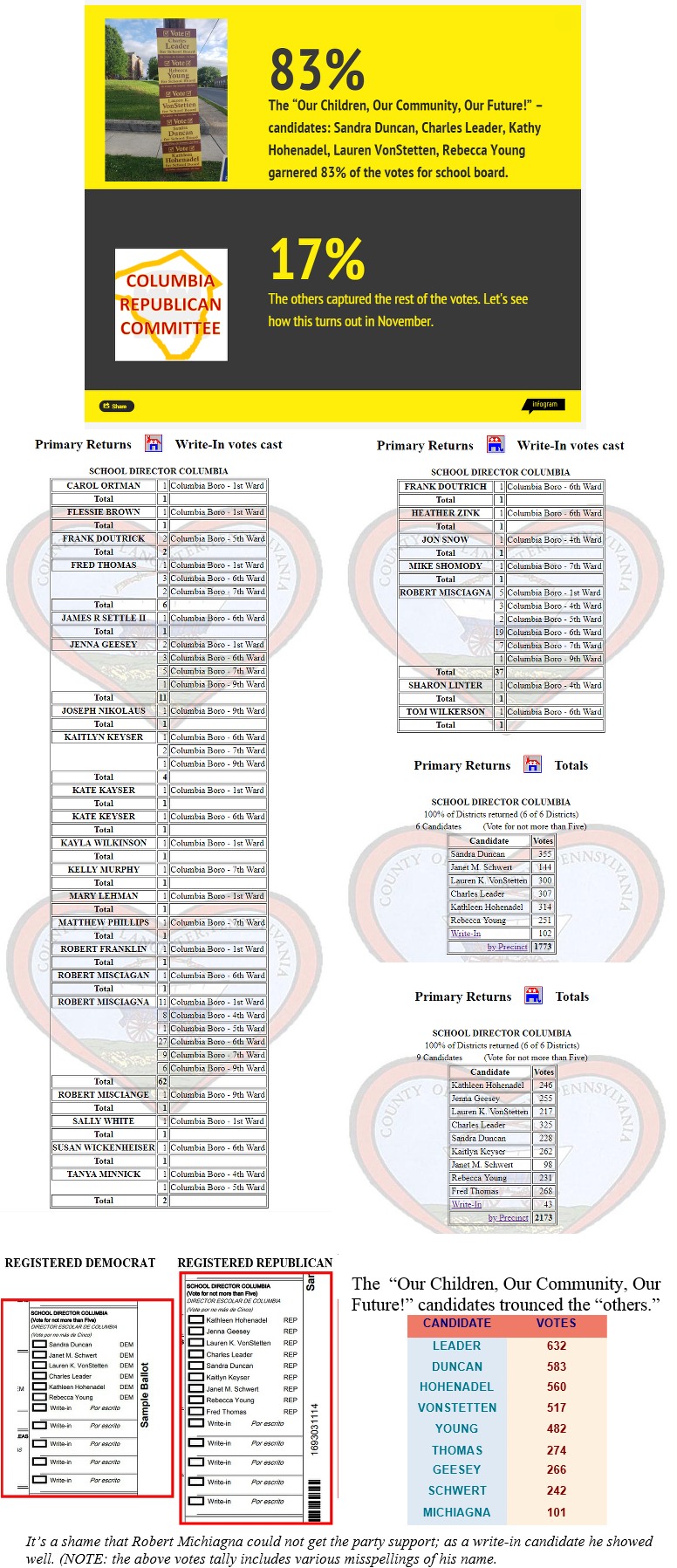 now final | The Lancaster County Board of Elections has now posted the School Board elections including the “write-in” candidates. The results in Columbia show that the entrenched folks can be overcome. We’ll see what happens in November when the “real” election is held. Are machine politics ready for a rude awakening?