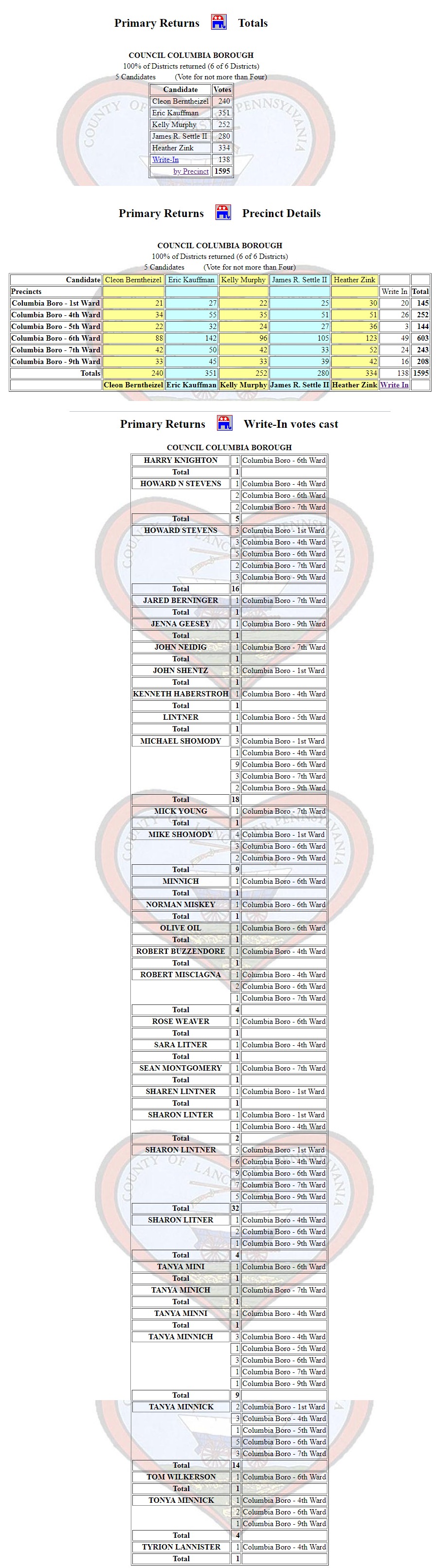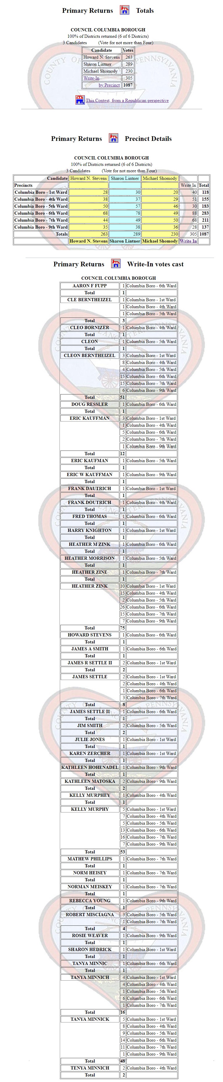 Finally, the write-in candidates have been tabulated and the results have been posted at the Lancaster County Board of Elections Website. What a difference might have been made if people writing in names spelled them correctly.