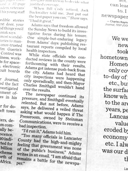 There was a special section in yesterday’s LNP – Always Lancaster dedicated to the celebration of the newspaper (and media company’s) 225th Anniversary. The above is a photo of an article in the section. How ironic that “too many officials in Lancaster County had the high-and-mighty-feeling that government was none of the public’s business.” Some still do — locally and nationally.