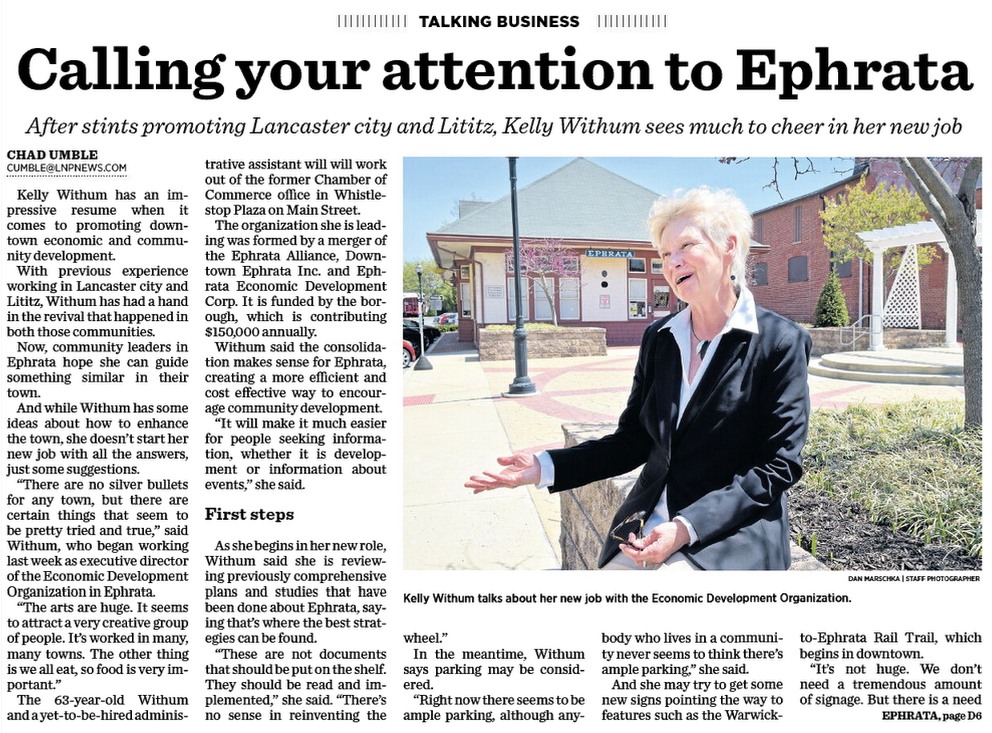 “Kelly Withum, who served as Venture Lititz’s executive director for nearly 10 years, has been hired as the new downtown executive director for Ephrata’s Economic Development Organization (EDO), a newly-created not-for-profit organization.” – The Ephrata Review