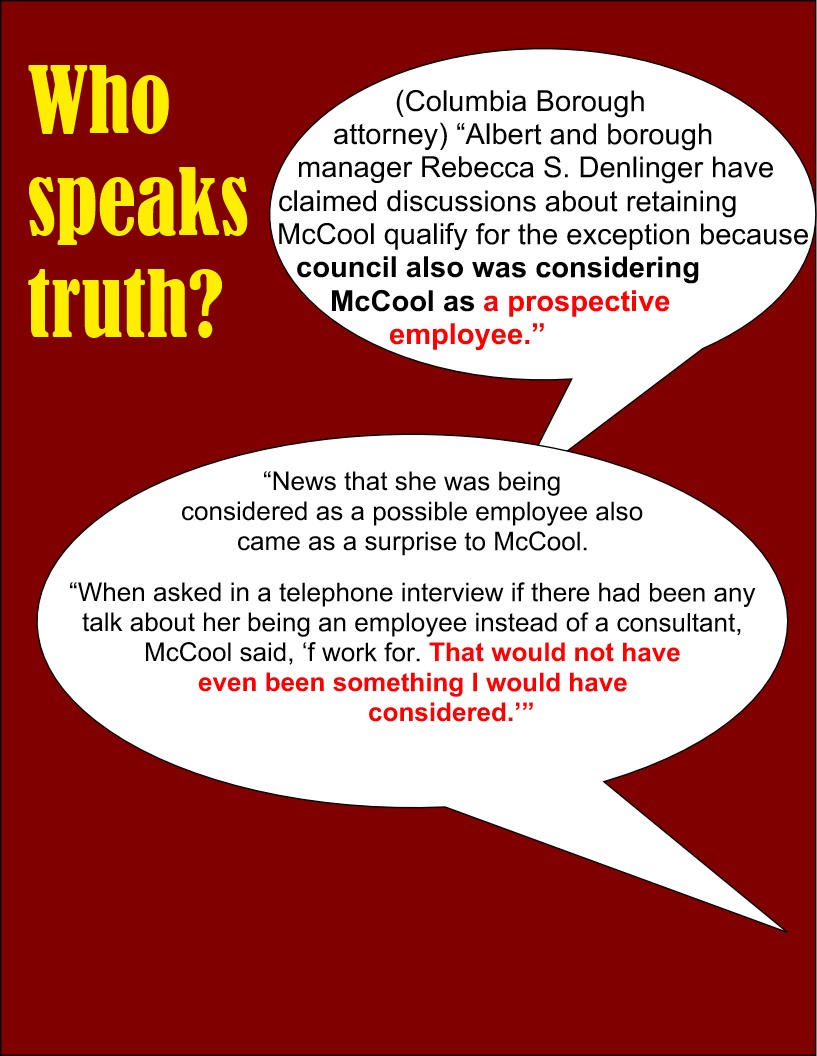 Indeed … who? | There’s yet another article in today’s LNP – Always Lancaster about the lack of transparency and truth among Columbia’s leadership. The above quotes come from this article, “DA receives Sunshine Act complaint; Columbia Borough resident objects to how council hired contractor.” Its worth picking up a copy of the paper. And it’s sad that citizens are compelled to file right-to-know documents to get the truth from borough officials. It’ll likely be a non-agenda item at tonight’s council “work session” meeting.