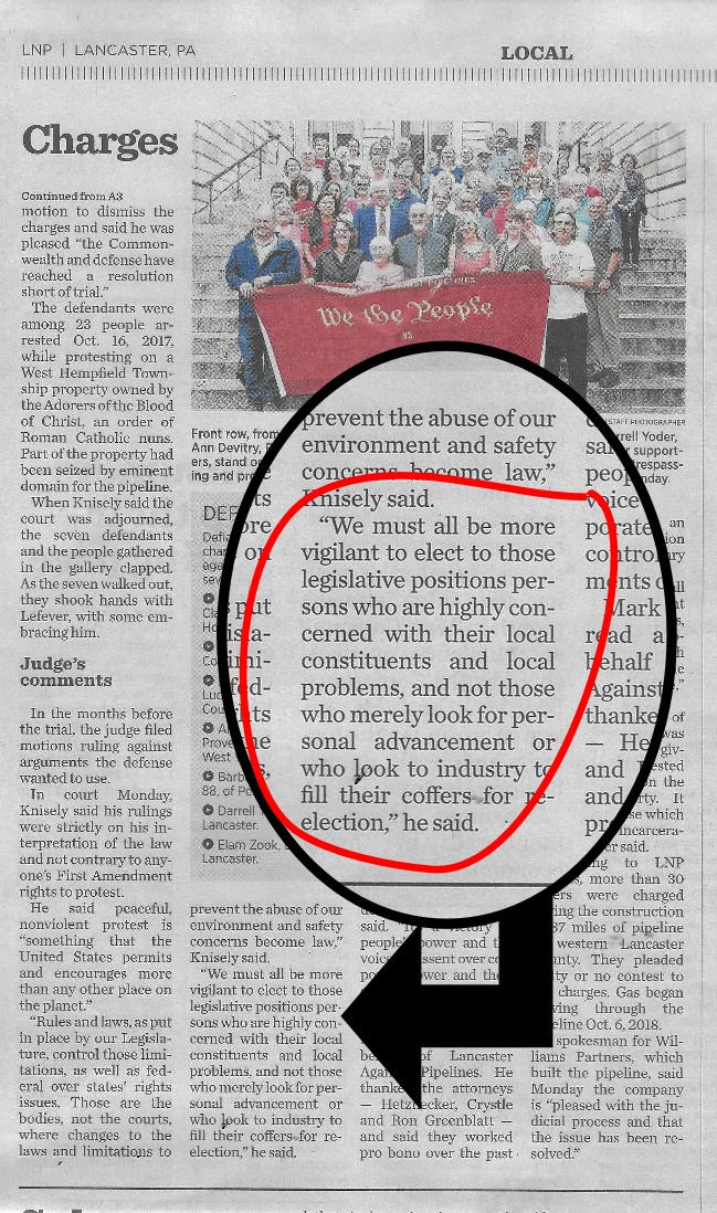Truer words were never spoken | On Tuesday charges were dropped against the seven Lancaster Countians who exercised their First Amendment rights, including: “the right of the people peaceably to assemble, and to petition the government for a redress of grievances.” In 2017, they were arrested for protesting  the construction of the gas pipeline running through the land owned owned by the “Adorers of the Blood of Christ, an order of Roman Catholic nuns” in West Hempfield Township. This article  appeared in Tuesday’s LNP – Always Lancaster; the judge’s comments are a stinging rebuke of legislation proposed by a Pennsylvania Senator from Lancaster County who stands way right of center. The editorial in today’s LNP – Always Lancaster agrees and ends with “But in his (Senator Scott Martin’s) zeal to get things done in Harrisburg, he’s reminded us occasionally of the proverbial bull in the china shop — and with HB 323 (sic), what stands to be broken is the First Amendment.”