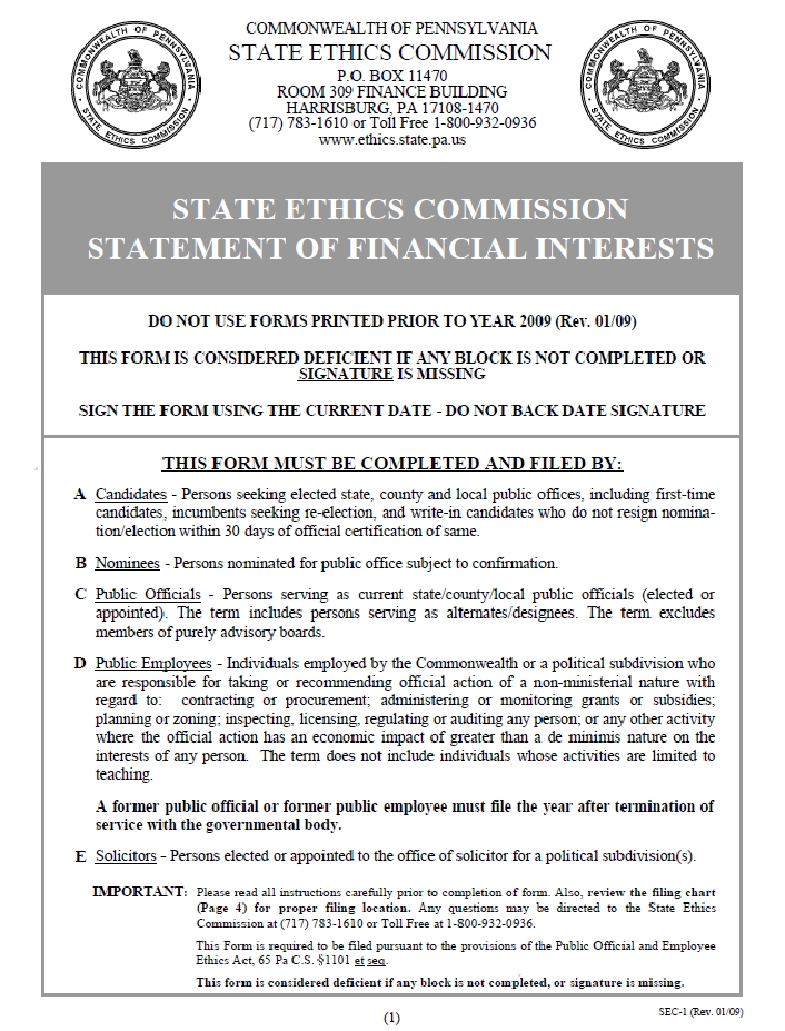 Pennsylvania has an ethics statute and the State Ethics Commission is the responsible agency for trying to make sure that the people in government at the state and local levels act in the best interests of the citizens they serve. Each year political candidates seeking office, nominees, elected and appointed public officials, public employees and solicitors truthfully complete the Form SEC-1. Chapter 11 of the State Ethics Commission code is entitled, “Ethics Stands and Financial Disclosure.” Ostensibly, citizens have a right to know that the public sector persons who work in the citizens’ interests are free from “financial entanglements.”