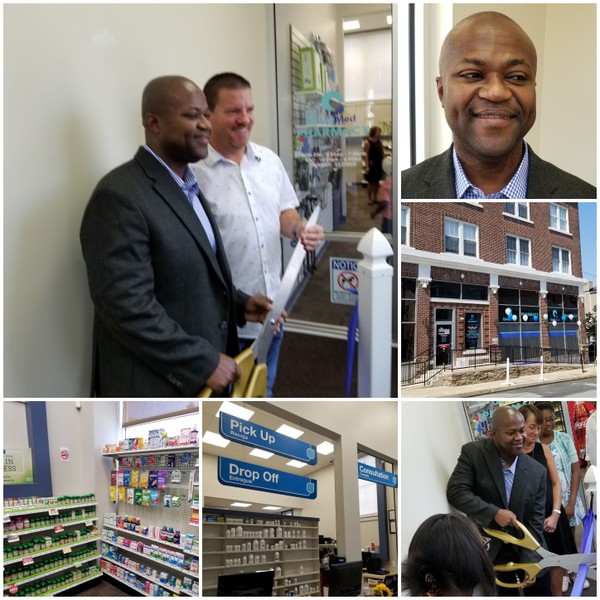 From top to bottom, left to right: Richard Boahene, principal and owner of QwikMed Pharmacy with Don Murphy, the principal of Cimarron Investments and the owner of the building that houses QuikMed Pharmacy; Boahene beams at the event; the pharmacy’s entrance on North Fourth Street; the actual ribbon cutting and two interior store photos. Boahene is a licensed pharmacist with years of experience with a major US drug store chain.