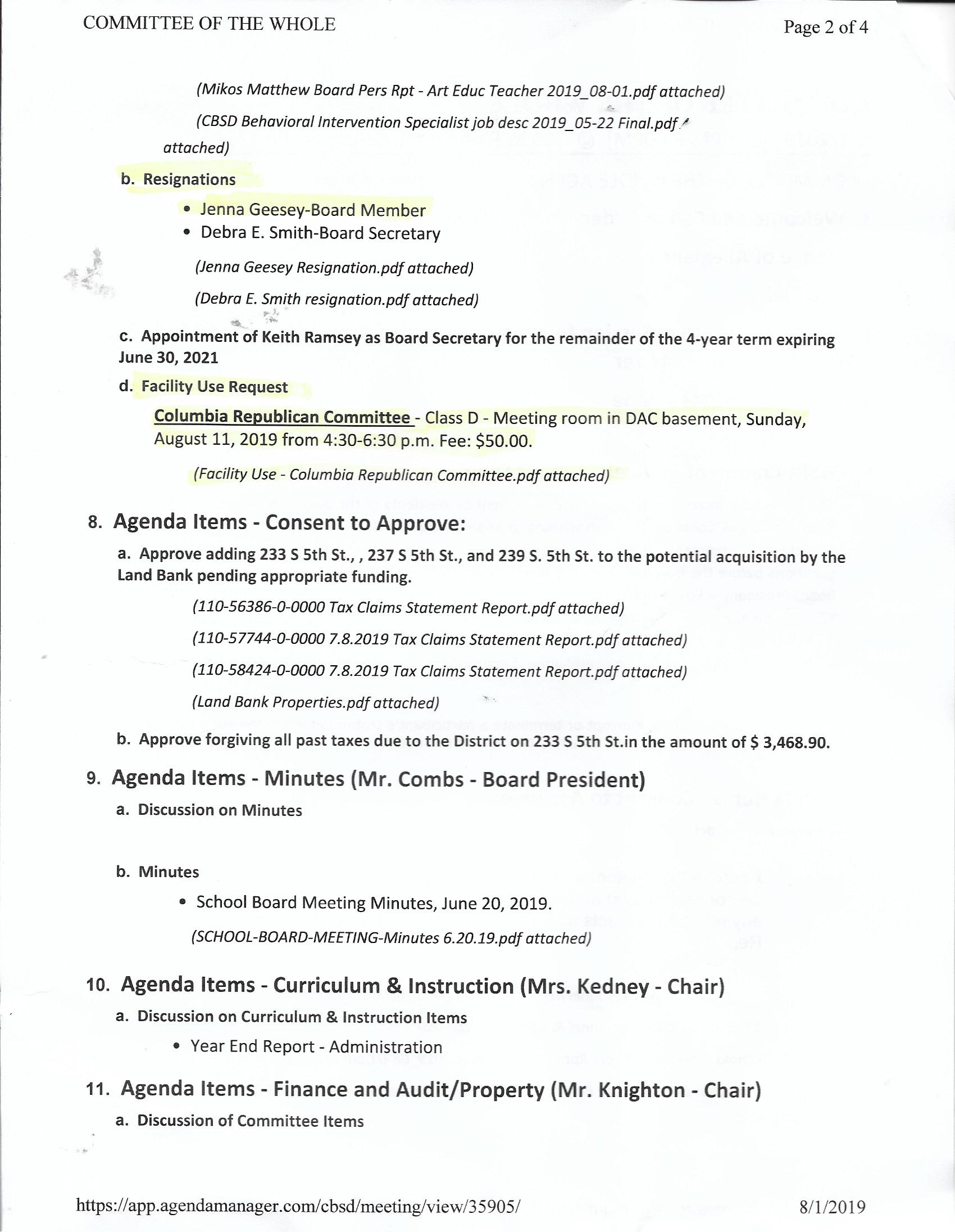 Surprise, surprise | Citizens who attended the meeting picked up an agenda that was markedly different than the one posted at the Website. Columbia Spy has photo files of the posted one. See the highlighted sections in the image above. Geesey’s resignation was not on the originally posted agenda; neither was the Facility Use Request. Understandably, changes can occur … but from yesterday morning to last night?