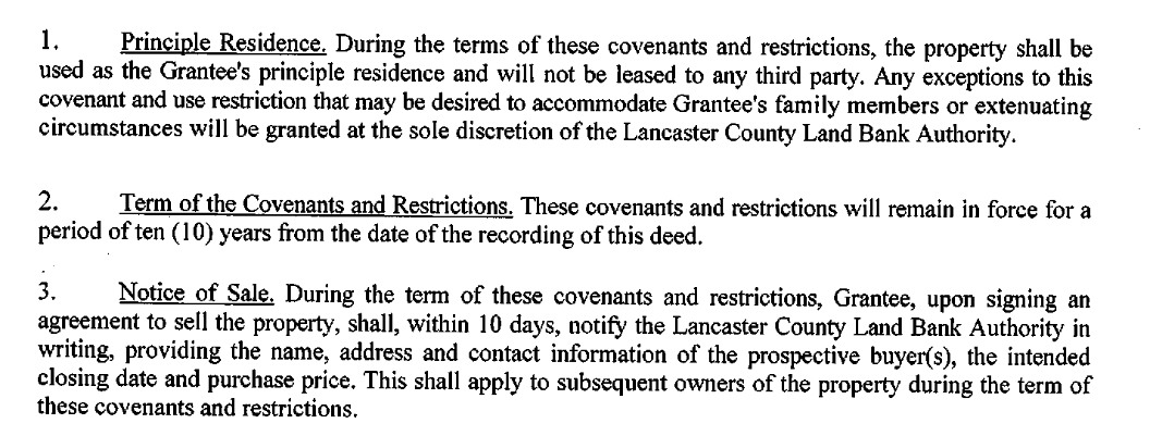 2. Not sure we can answer that without arduous research, but we’ve added some of the conditions from the deed to the article. The property must be occupied by the principle residence and may not be leased.