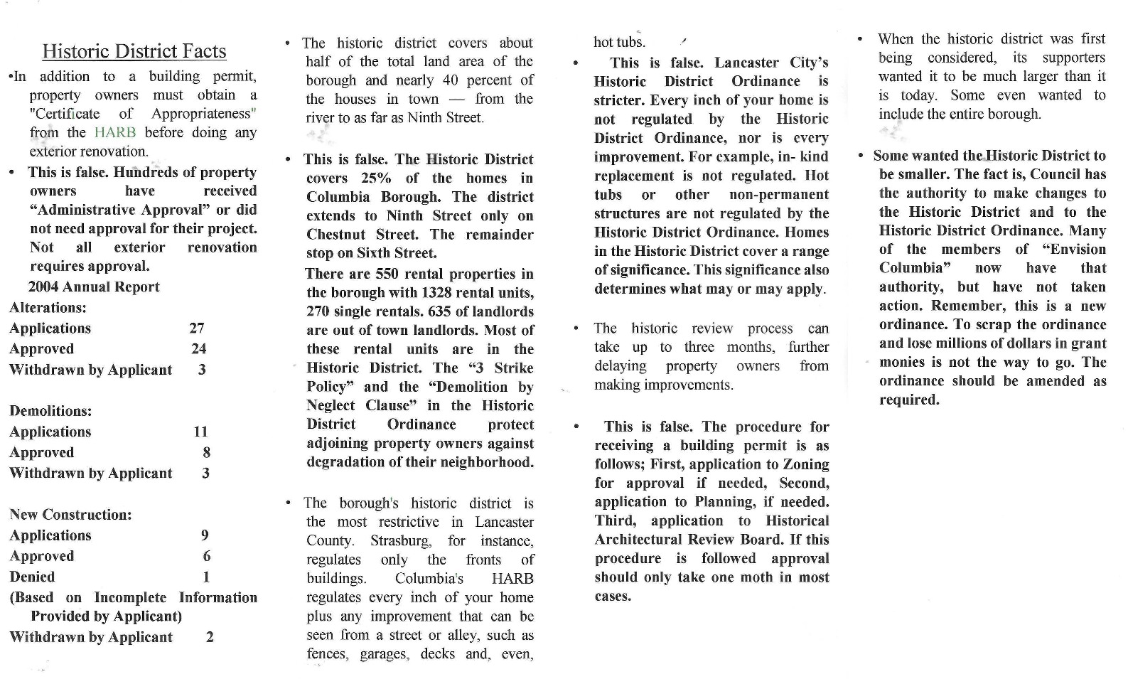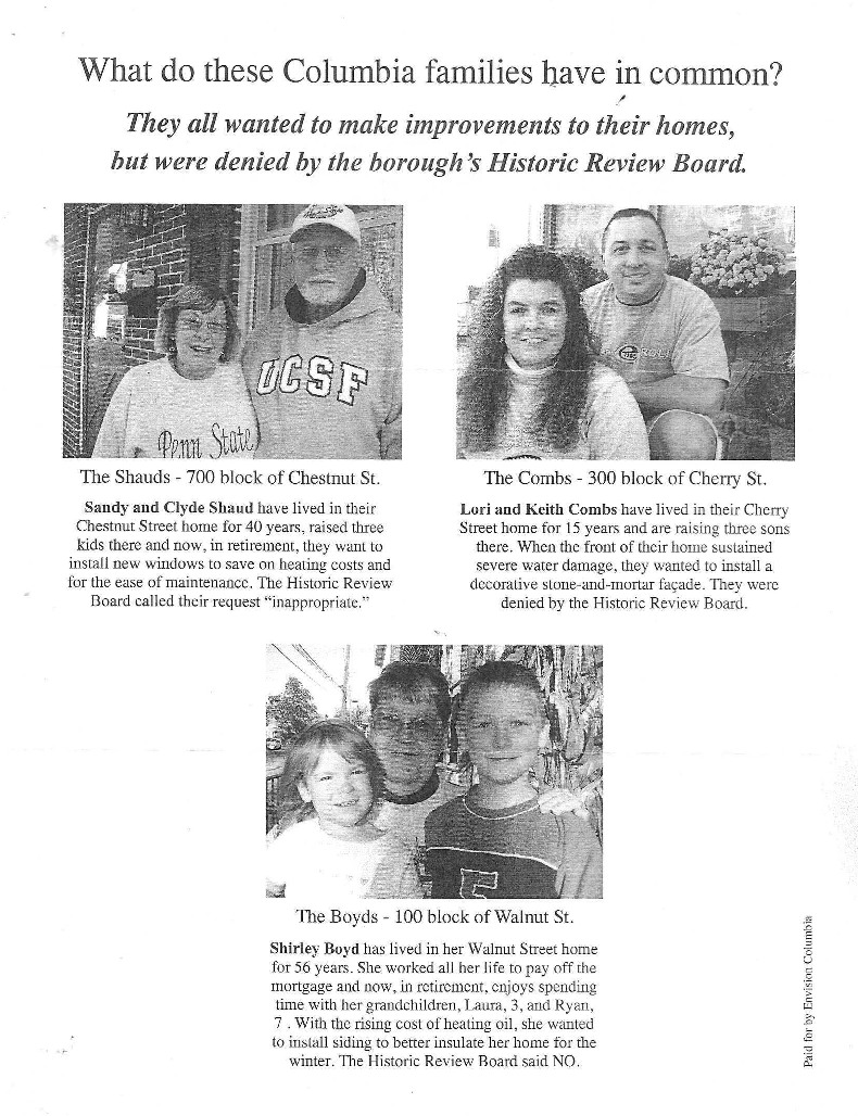 In late 2005 and early 2006, separate factions in Columbia were engaged in controversy about Columbia’s Historic Architectural Architectural Review Board’s interpretations. Now, as then, the controversy centered on supporting legislation and application of the legislation. Then, too, Columbia was one of two boroughs in the county with a H.A.R.B. — Strasburg was, and is, the other.