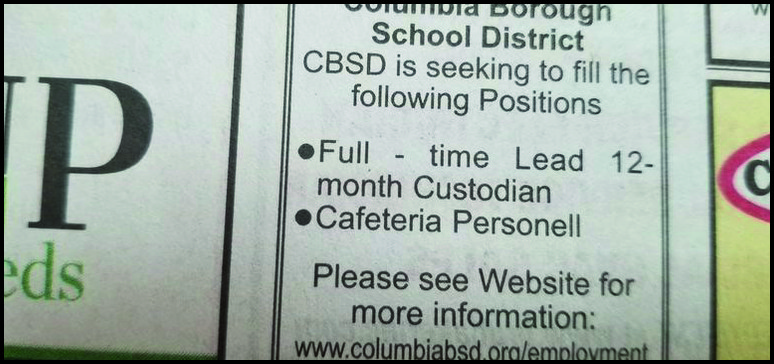 Now that’s not funny! | Hard to tell where the fault lies, but spelling “personnel” incorrectly is not a laughing matter … especial for a school district. – in the classified section of yesterday’s LNP – Always Lancaster.