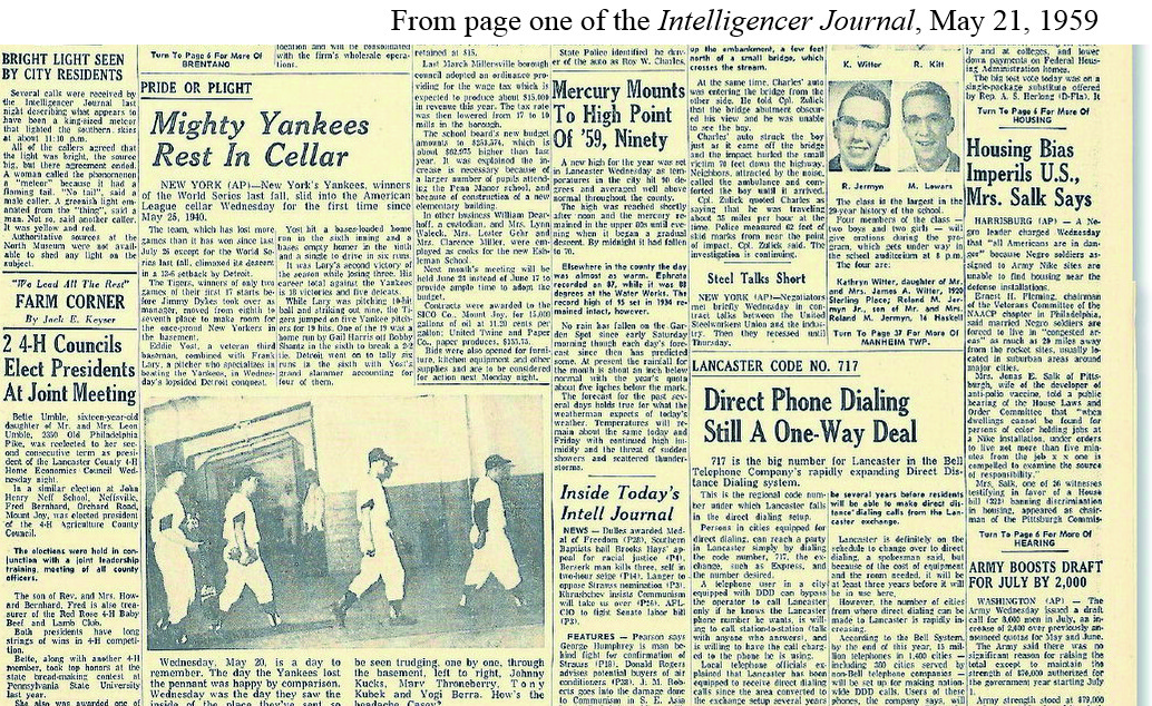 19 separate articles | It’s interesting to look at the page design and that there were 19 separate articles on the page one replicated in today’s LNP – Always Lancaster. Note the high temperature article and the 717 area code article. And the Yankees were in last place in late May. The Yankees finished the year in third place as the Chicago White Sox won the pennant that year.