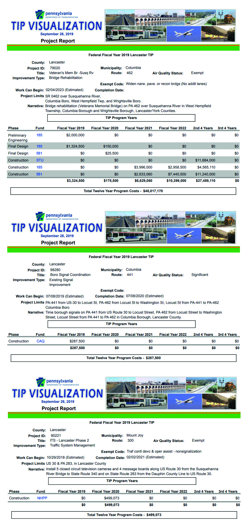 Penn DOT’s plans | The Pennsylvania Department of Transportation has these Transportation Improvement Projects (TIP) on tap for the Columbia Area (click on the graphic to enlarge).