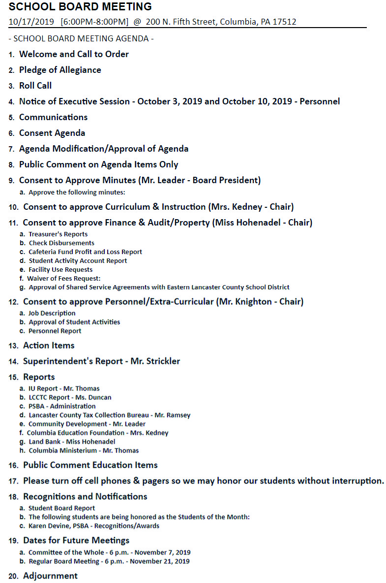 School board meeting tonight | Click on the graphic below to enlarge. On the agenda is item 11, g.: “Approval of Shared Service Agreements with Eastern Lancaster County School District.” LNP – Always Lancaster reported yesterday, that “Under this extension, Columbia would continue to receive support from three members of Elanco’s full-time staff: Keith Ramsey, business manager; Donna Prokay, human resources director; and Lotsie Wooten, IT director. Additionally, Columbia would receive its own tech support specialist, alongside an array of network services and equipment. The service would be provided to Columbia at an annual cost of $315,000, up $35,000 from the prior agreement.”