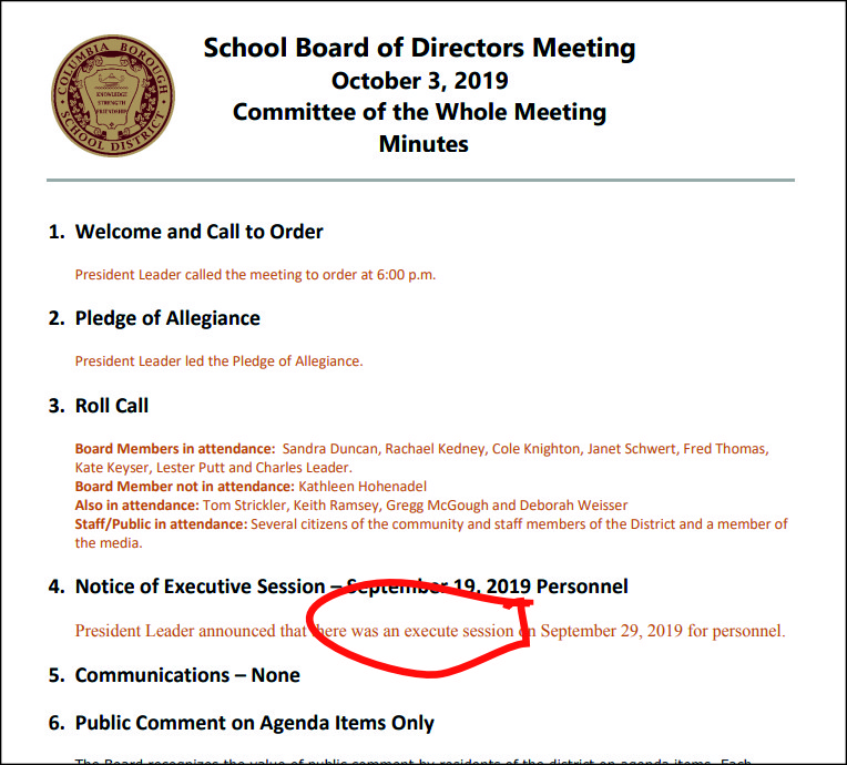 Wonder who? | The October 3 School Board of Directors Meeting minutes shows an “execute session.” Wonder who was executed? Wonder whether it was literal or figurative?