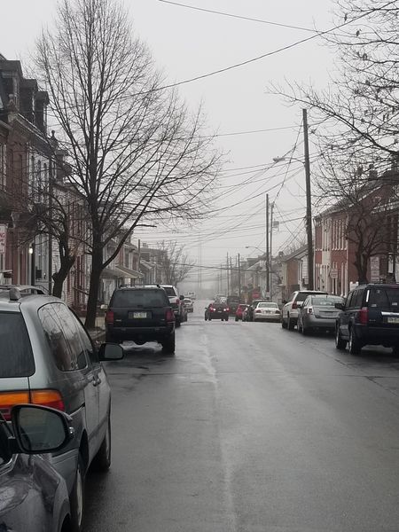 Where’s The River? Tough to see in this misty view down Perry Street.