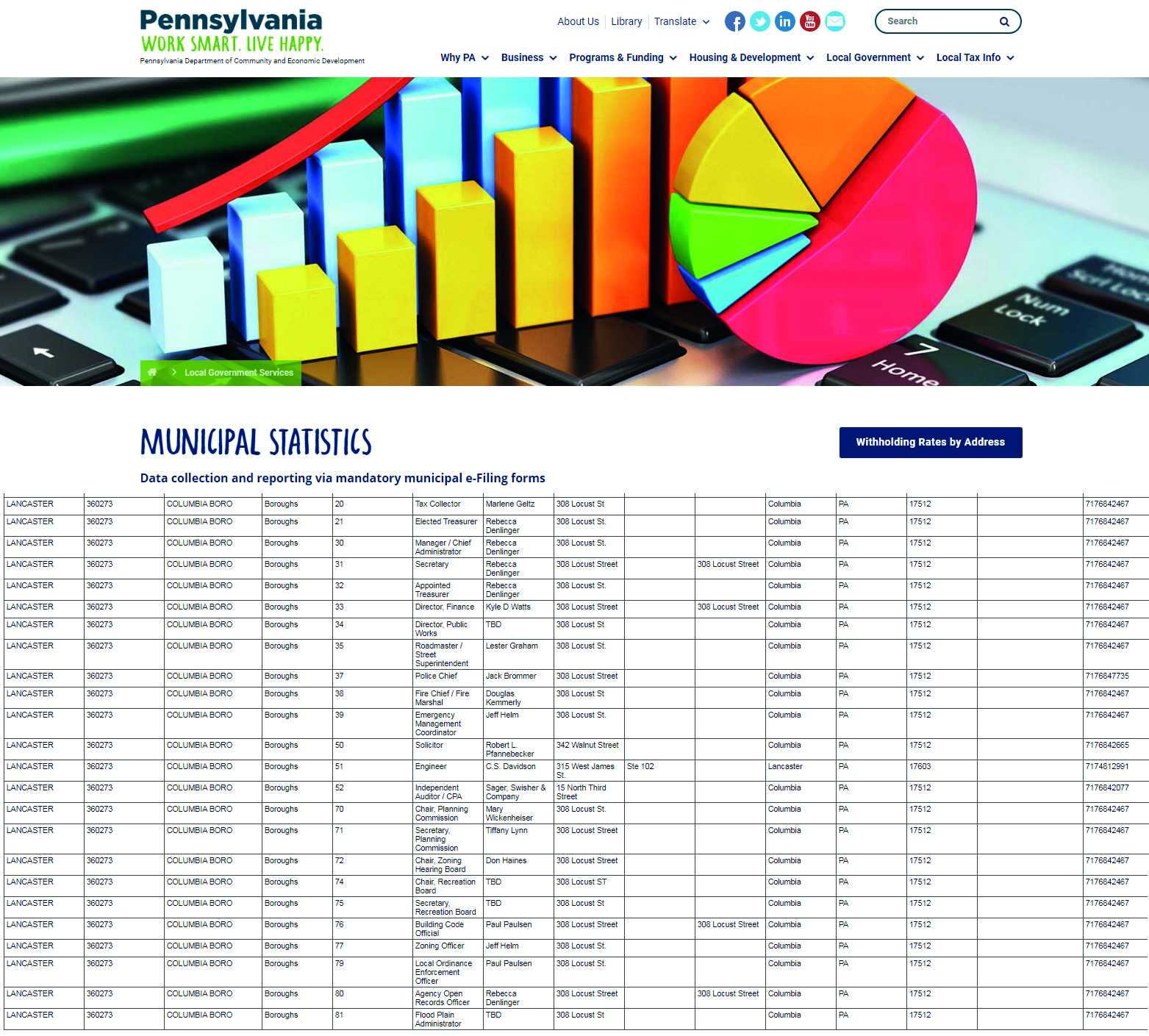 Apples to apples | Pennsylvania’s Department of Community and Economic Development has the comparative information for citizens to draw comparisons in government metrics. “The Municipal Statistics Office collects data from municipalities through required e-Filing forms and publishes the information in a series of online databases and reports which are accessible through the links below.” Citizens can get metrics and information about Pennsylvania’s municipal entities and see how their municipality stacks up against others. Citizens can see, for example, that Columbia reported having 45 full time employees and 21 part-time employees in 2018 and Elizabethtown reported having 41 full time employees and 11 part-time employees. Columbia’s population is reported as 10,400; Elizabethtown’s, 11,545.