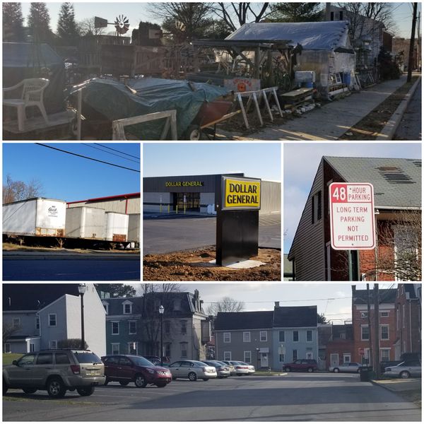 Top to bottom, left to right: What people coming to Columbia see coming to town via the Route 462 “gateway.” A brand spanking new Dollar General across The River outside of Wrightsville north of the Rutter’s Store on Cool Springs Road between Route 462 and US Route 30). The sign by the not-long-ago-completed parking area on Commerce Street reads “LONG TERM PARKING NOT PERMITTED.” What is the definition of “Long Term Parking?” A photo of the parking area.