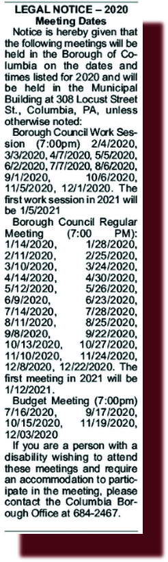2020 Columbia Borough meeting dates published in today’s LNP – Always Lancaster (click on image to enlarge) ALSO published at the Borough’s Website.