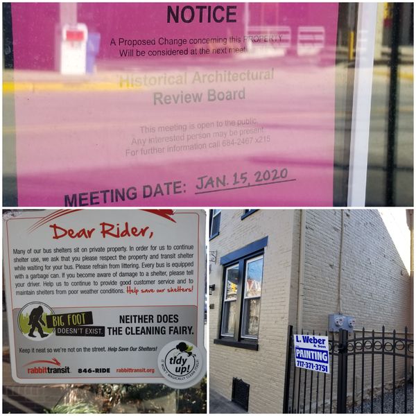 The notification of the Historical Architectural Review Board’s hearing slated for later today; this building is in the 400 block of Locust Street. A rabbittransit sign gently reminds folks to refrain from littering. Another welcome L. Weber sign; this company’s sign in in front of a building means the building will be “looking great.”