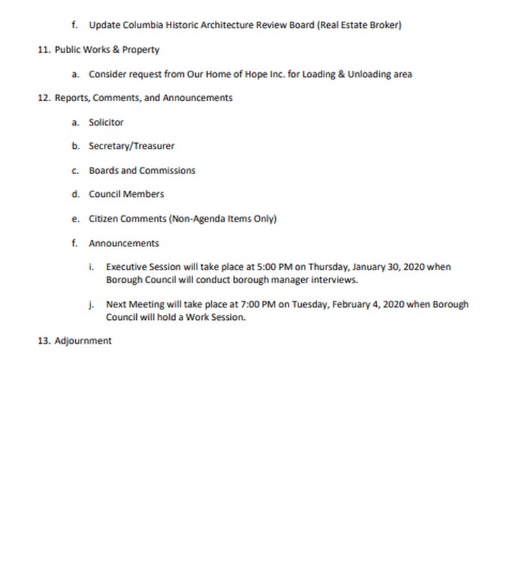 January 24, 2020 17512 Columbia Borough Council Meeting agenda and meeting packet for Tuesday’s meeting and this consulting assignment ends. included in the meeting packet NOTE: to enlarge any of the above meeting graphics, click on the graphic. Share this: Click to share on Facebook (Opens in new window) Facebook Click to share on X (Opens in new window) X Like Loading... Related