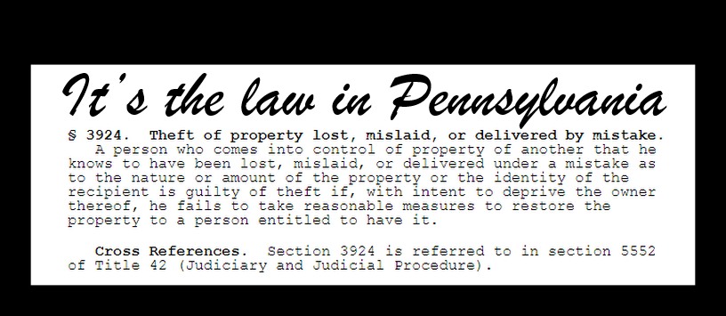Find something on the sidewalk? | “‘Finders Keepers, Losers Weepers’ – Not So in Pennsylvania” – Mystatecollegelawyer.com
