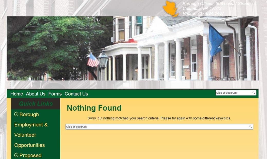 Years earlier | Elizabethtown passed Resolution 2013-7 adopting Rules of Decorum for Public meetings; and citizens can find it by entering “rules of decorum” into the search bar at the Elizabethtown Website. Then again, Elizabethtown has a superior Website using the CivicPlus platform.