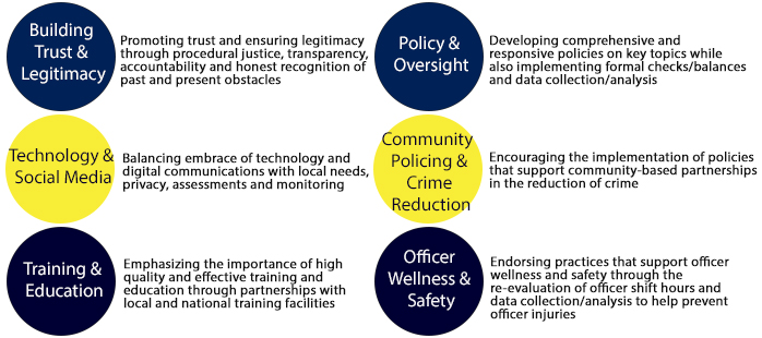 “The Department of Justice’s Community Oriented Policing Services (COPS) Office is supporting national efforts to implement the recommendations outlined in the President’s Task Force on 21st Century Policing Report. The Task Force recommendations provide meaningful solutions to help law enforcement agencies and communities strengthen trust and collaboration, while ushering the nation into the next phase of community-focused policing. The Task Force recommendations are divided into six pillars:”