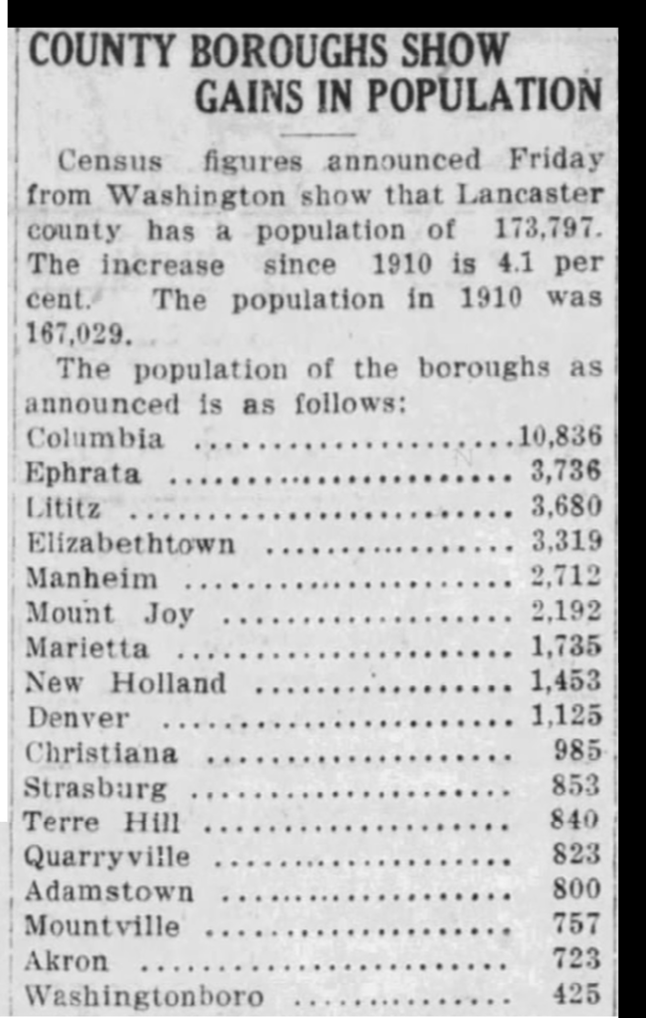So, why … | is Columbia the only municipality in Lancaster County to have lost population in the past 100 years? Is it the visionary political leadership? Lancaster County’s population has increased a dramatic 327 percent; overwhelmingly, its separate municipalities have experienced similar explosive growth. Yet, Columbia lags and loses. Strategically located between two huge markets (Lancaster and York) it has every natural advantage. What’s holding Columbia back? Too many years of what?
